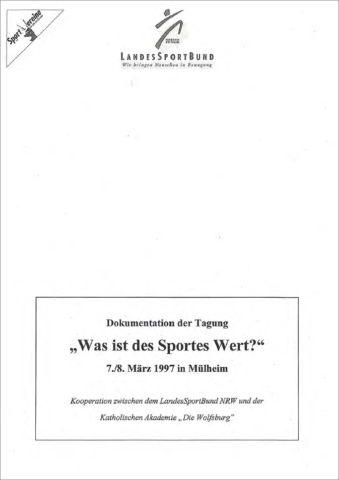 Lienkamp, Andreas / Weingärtner, Claus (Hrsg.): Was ist des Sportes Wert? Dokumentation der 1. Tagung zur Sportethik, veranstaltet vom Arbeitskreis "Kirche und Sport" in Nordrhein-Westfalen, der Katholischen Akademie "Die Wolfsburg" und dem LandesSportBund Nordrhein-Westfalen. Mit Beiträgen von Richard Winkels, Ilse Brusis, Franz Grave, Rudolf Streinz, Eckhard Meinberg und Christoph Hübenthal, Duisburg-Mülheim/Ruhr 1997.