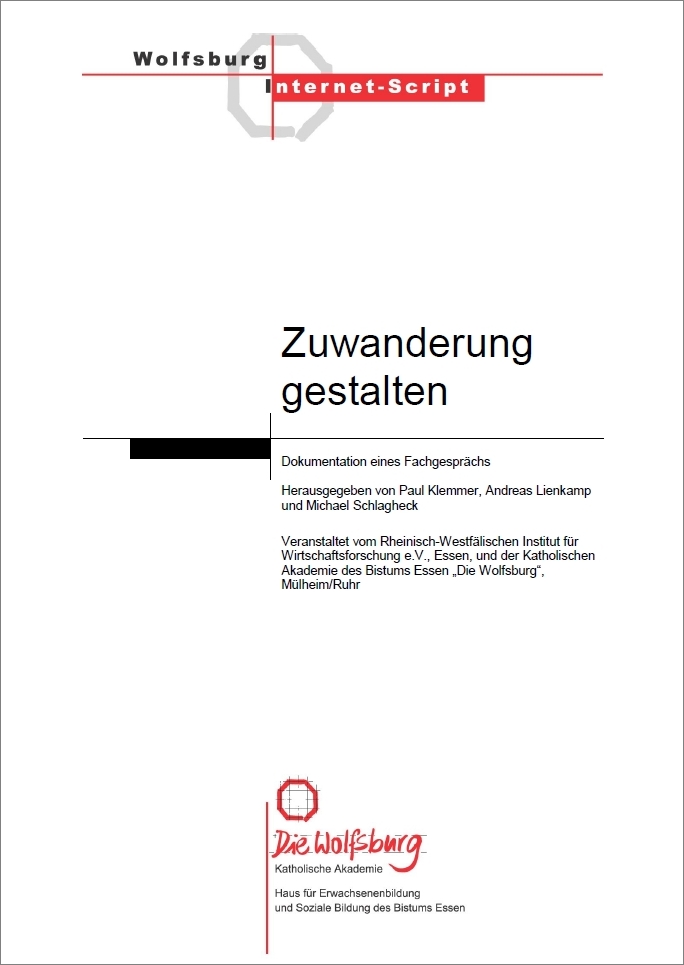 Klemmer, Paul / Lienkamp, Andreas / Schlagheck, Michael (Hrsg.): Zuwanderung gestalten. Dokumentation eines Fachgesprächs, veranstaltet vom Rheinisch-Westfälischen Institut für Wirtschaftsforschung e.V. und der Katholischen Akademie "Die Wolfsburg" (Wolfsburg-Internet-Script), Mülheim/Ruhr 2001.