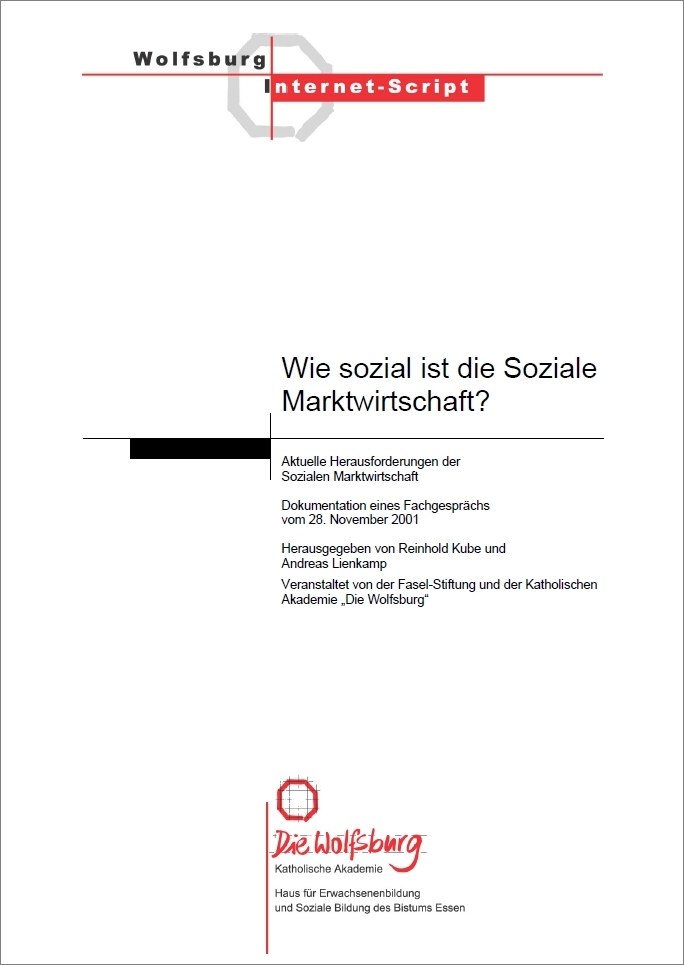 Kube, Reinhold / Schlagheck, Michael (Hrsg.), unter Mitarbeit von Andreas Lienkamp: Wie sozial ist die Soziale Marktwirtschaft? Aktuelle Herausforderungen der Sozialen Marktwirtschaft. Dokumentation eines Fachgesprächs vom 28. November 2001, veranstaltet von der Fasel-Stiftung und der Katholischen Akademie "Die Wolfsburg" (Wolfsburg-Internet-Script), Mülheim/Ruhr 2002.