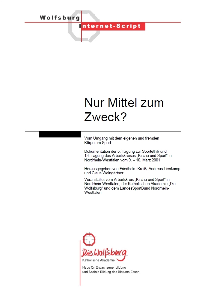 Kreiß, Friedhelm / Lienkamp, Andreas / Weingärtner, Claus (Hrsg.): Nur Mittel zum Zweck? Vom Umgang mit dem eigenen und fremden Körper im Sport. Dokumentation der 5. Tagung zur Sportethik, veranstaltet vom Arbeitskreis "Kirche und Sport" in Nordrhein-Westfalen, dem LandesSportBund Nordrhein-Westfalen und der Katholischen Akademie "Die Wolfsburg" (Wolfsburg-Internet-Script), Mülheim/Ruhr 2002.