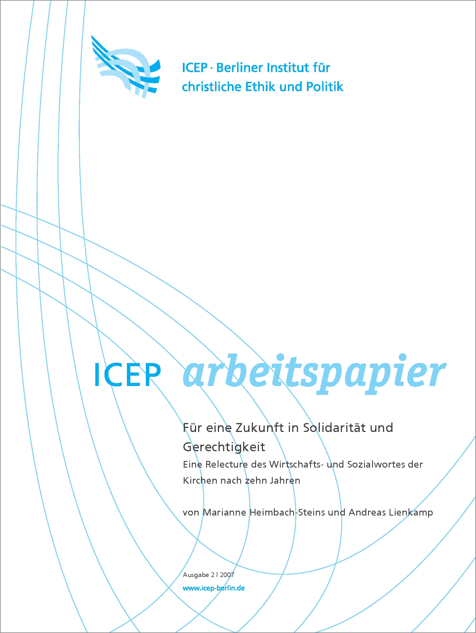 Heimbach-Steins, Marianne / Lienkamp, Andreas: Für eine Zukunft in Solidarität und Gerechtigkeit. Eine Relecture des Wirtschafts- und Sozialwortes der Kirchen nach zehn Jahren (ICEP arbeitspapier 2/2007), Berlin: ICEP 2007 (ISSN 1860-5850).