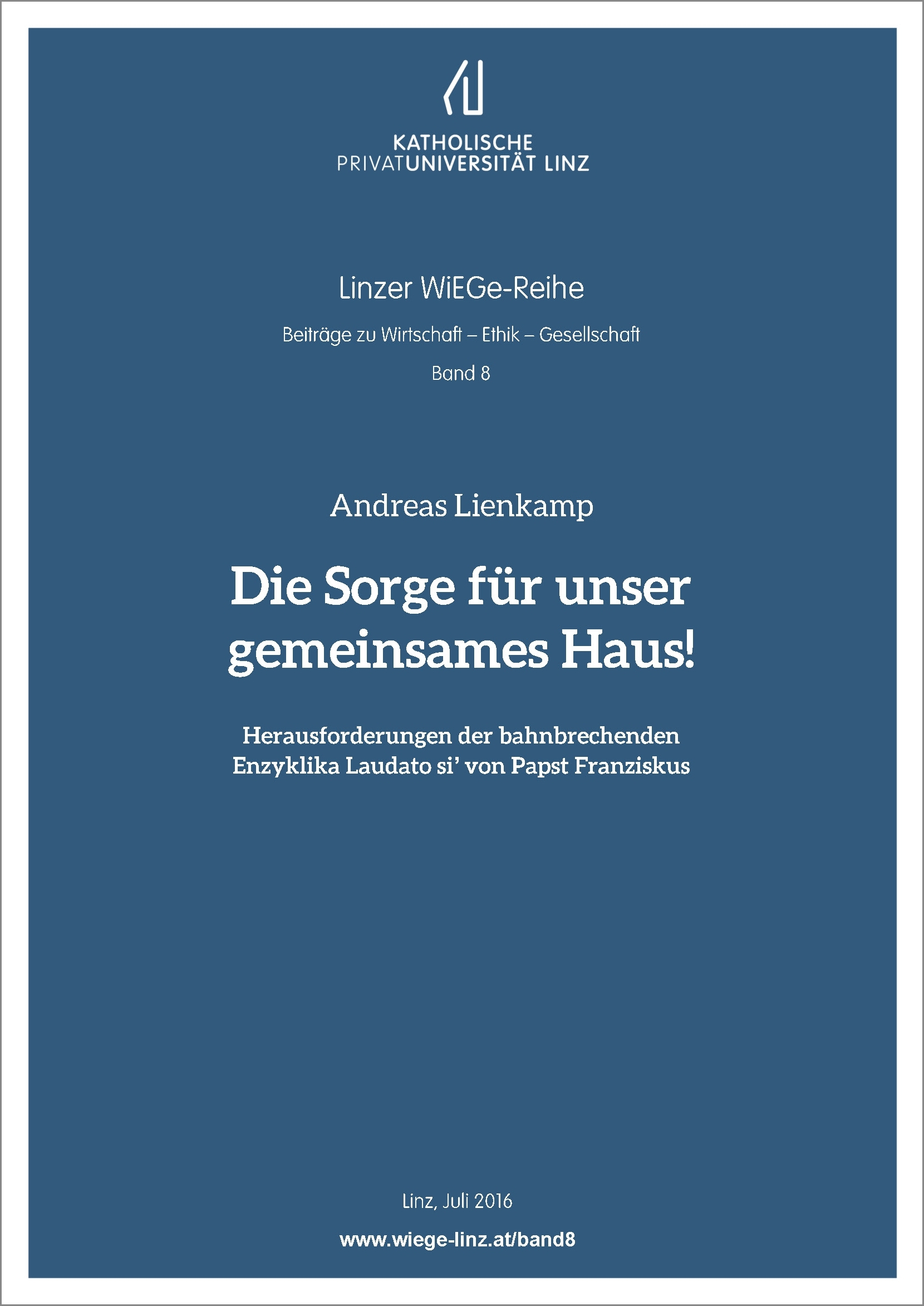 Lienkamp, Andreas: Die Sorge für unser gemeinsames Haus! Herausforderungen der bahnbrechenden Enzyklika Laudato si' von Papst Franziskus (Linzer Beiträge zu Wirtschaft - Ethik - Gesellschaft 8), Linz: Katholische Privatuniversität 2016 (ISSN 2071-0844).
